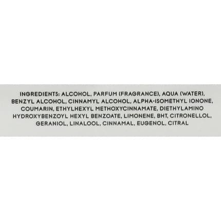 Alcohol, Parfum (Fragrance), Aqua (Water), Benzyl Alcohol, Cinnamyl Alcohol, Alpha-Isomethyl Ionone, Coumarin, Ethylhexyl Methoxycinnamate, Diethylamino Hydroxybenzoyl Hexyl Benzoate, Limonene, BHT, Citronellol, Geraniol, Linalool, Cinnamal, Eugenol, Citral.