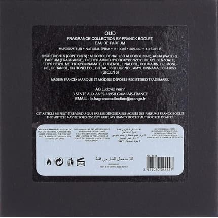 Nom du parfum : Franck Boclet Oud Eau de Parfum Spray For Him 100ml : Une symphonie orientale boisée Franck Boclet Oud , une fragrance emblématique de la maison Franck Boclet , est une ode à la sensualité et au mystère. Ce parfum pour homme, captivant et sophistiqué, est une interprétation audacieuse et contemporaine de l'accord oud, un ingrédient précieux et vénéré en parfumerie orientale. Il s'adresse à l'homme moderne, sûr de lui, qui apprécie les fragrances riches et complexes, et qui n'a pas peur d'affirmer sa personnalité. Imaginez dévoiler un flacon d'un noir profond, presque énigmatique. Le bouchon métallique, lourd et froid au toucher, promet une expérience olfactive exceptionnelle. En vaporisant Franck Boclet Oud, vous libérez une essence puissante et envoûtante, qui vous transporte instantanément dans un univers de luxe et de raffinement. C'est un parfum qui raconte une histoire, celle d'un voyage au cœur des senteurs orientales, où les épices chaudes se mêlent aux bois précieux.